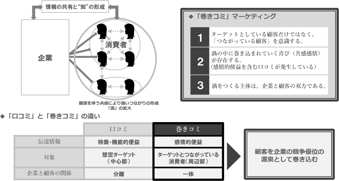 そこで、これらの「散在する点(顧客、口コミ)を巻き込み、渦にしていく活動」を、「巻きコミマーケティング」として2009年に提言した。