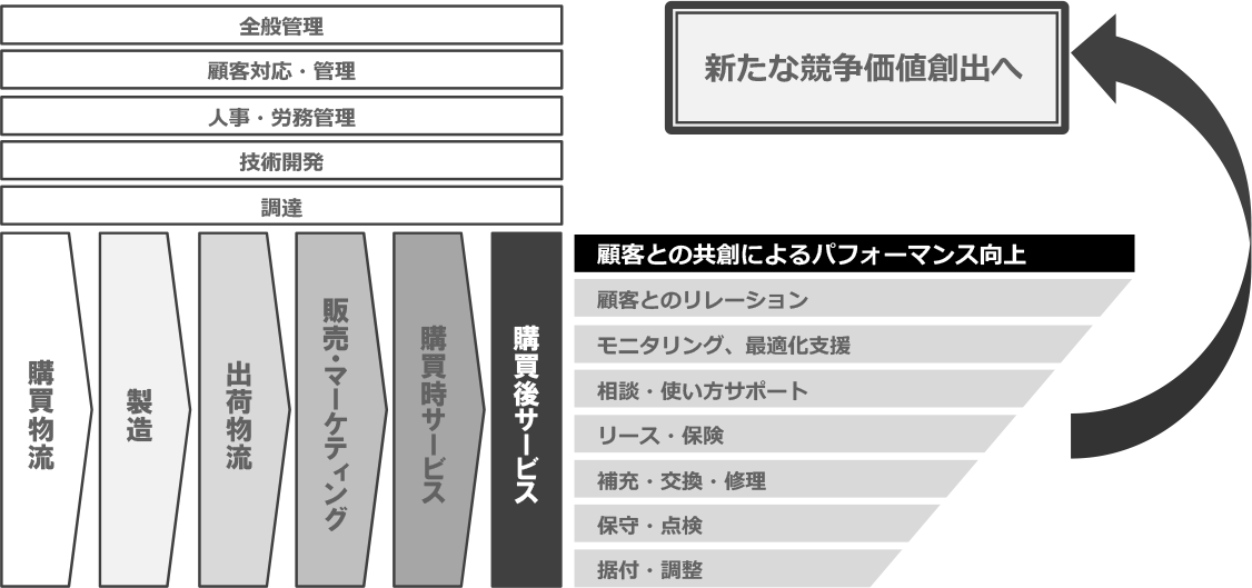 購入時のサービス(接客や購入アドバイス)、購入後のアフターサービスにとどまらず、利用製品のパフォーマンスを高め、アフターで得られたことを引き継ぐことで、新たな競争力強化の可能性へと拡げることができる。これらによる価値を、「アフターバリュー」として2014年に提言した。