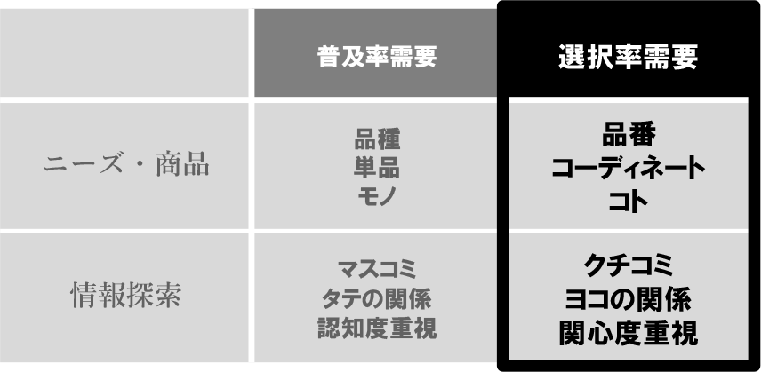 ・「~のジャンルのものが欲しい」から、「コレが欲しい」に変わるのが、選択率需要である。