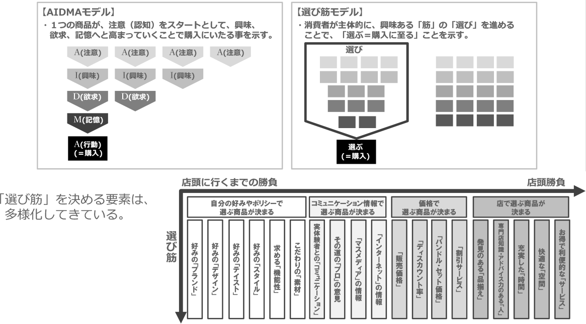 多種多様な商品の中から、個々が「選んでいく」基準を、「選び筋」として2008年に提言した。