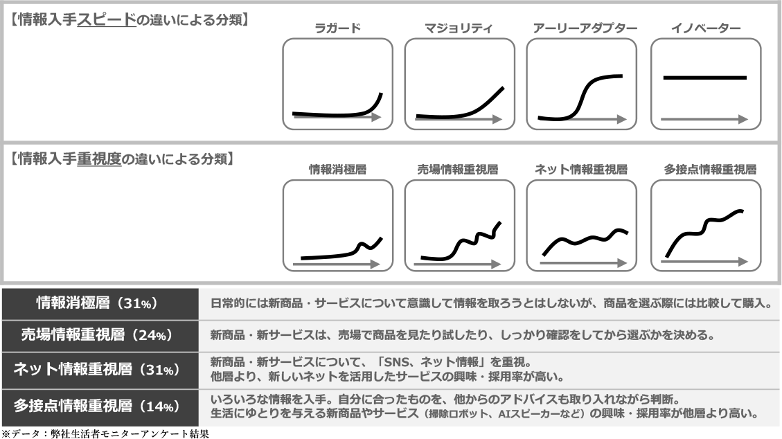 ・インターネットが普及し、「情報入手スピード」に格差がなくなってきている。新商品・新サービスの浸透は、どの情報をどれだけ選択するかという「情報入手重視度」による違いが出てきている。