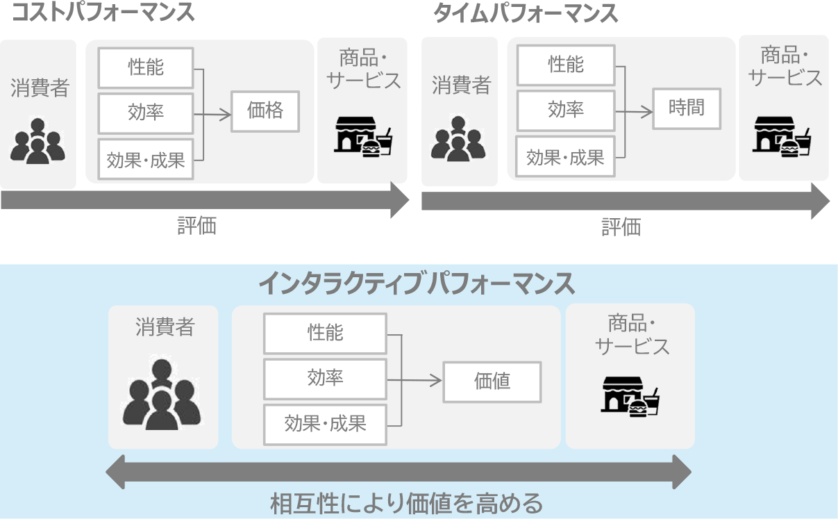 ・「コストパフォーマンス」「タイムパフォーマンス」を重視する人が増えるが、これらのパフォーマンスは、評価する側が、評価する人やモノに対して、一方向的に、評価をした結果である。一方で、SNSやファンミーティングなど、企業と消費者がインタラクティブにコミュニケーションできる機会は増えている。企業と消費者の間で相互につくられるパフォーマンスの重要性を加味した「インタラクティブパフォーマンス」を、2025年に提言した。